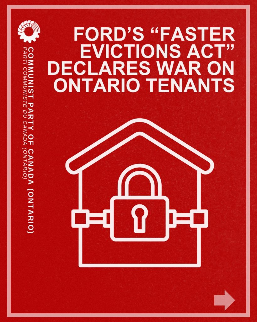 This fall, the government is deploying the same omnibus strategy with Bill 60, the so-called Fighting Delays, Building Faster Act. While public outcry and tenant organizing forced the government to retract its most egregious proposal—a backdoor to end rent control via fixed-term leases—the bill remains a full-scale assault on tenants and democratic municipal planning. Its provisions are a direct attack on working-class Ontarians: it drastically shortens the time tenants have to respond to or appeal eviction notices, makes it harder to withhold rent over maintenance issues, and reduces compensation for those evicted for a landlord’s “personal use.” It empowers the government to override local zoning to favour certain developments while simultaneously banning municipalities from creating dedicated bus lanes or cycling lanes on many streets. This move jeopardizes both rapid transit expansion and the viability of affordable, family-friendly mid-rise housing, proving that the government’s agenda is not about solving the housing crisis but about guaranteeing developer profits. This contrasts sharply with the Communist Party’s demands, which include building hundreds of thousands of units of social housing to build public housing stock and enacting universal rent control including coverage on vacant units and rent roll-backs across Ontario.